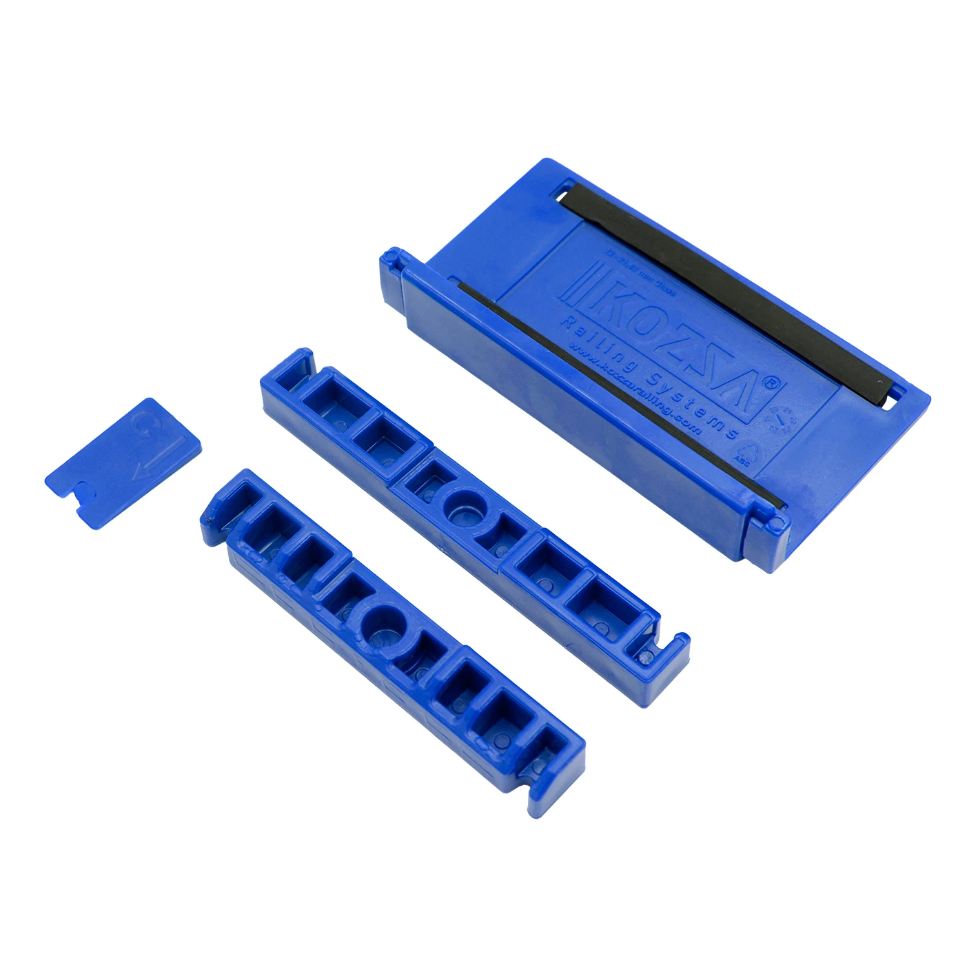 Kestävästä ABS-muovista valmistetut osat käsittävät päärungon sisäänrakennetulla kumisella stabilointilisäyksellä, välilistalla ja lukitusklipsillä. Jokainen osa on merkitty kirjaimilla A ja B, mikä helpottaa asennuspuolien tunnistamista.