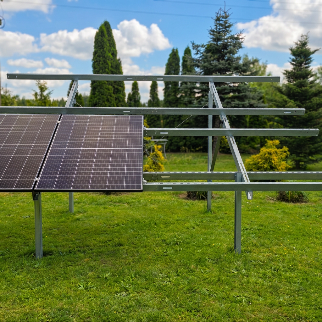 Mitä N2V tarkoittaa? Lyhenne jakautuu seuraavasti: N – rakenteen muoto sivulta katsottuna (kaksi tukea yhdistetty vinolla vahvikkeella muodostavat N-kirjaimen), 2 – kaksi jalkarivistöä (etu- ja takaosa), V – paneelien pystysuora asettelu. Kahden jalkarivistön ansiosta paneelit ovat tukevasti tuettuina molemmilta puolilta, mikä toimii erityisen hyvin vaihtelevilla maaperäalueilla. Light: tuuli enintään 22 m/s (79,2 km/h), lumikuorma 1,2 kN/m² (noin 122 kg/m²). Jos etsit kevyempää vaihtoehtoa, tutustu T1V-versioon yhdellä jalkarivistöllä – ihanteellinen, kun haluat vielä nopeamman asennuksen.