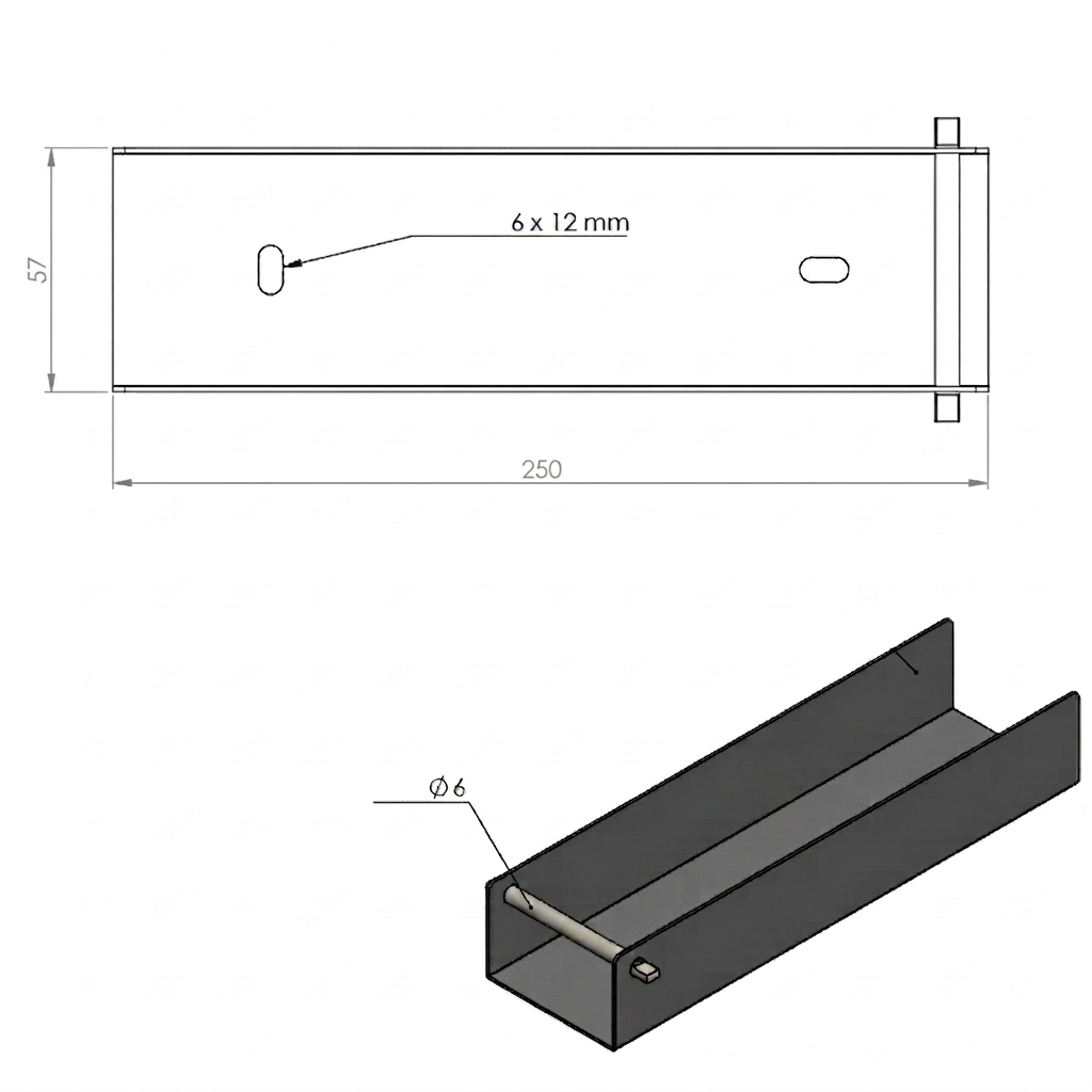 C-kiskolla on C-kirjaimen muotoinen profiili, johon betonisokkelilevy asetetaan. Profiilin ulkoinen leveys on 57 mm, mikä mahdollistaa 55 mm paksuisen levyn vapaan ja vakaan sijoittamisen pienellä asennusväljyydellä, joka helpottaa kiinnitystä. Sisäänrakennettu poikittaistanko Ø 6 mm toimii lukituksena – estää sokkelin liukumisen pois kiinnikkeestä, lisäten koko aitarakenteen kestävyyttä ja turvallisuutta.