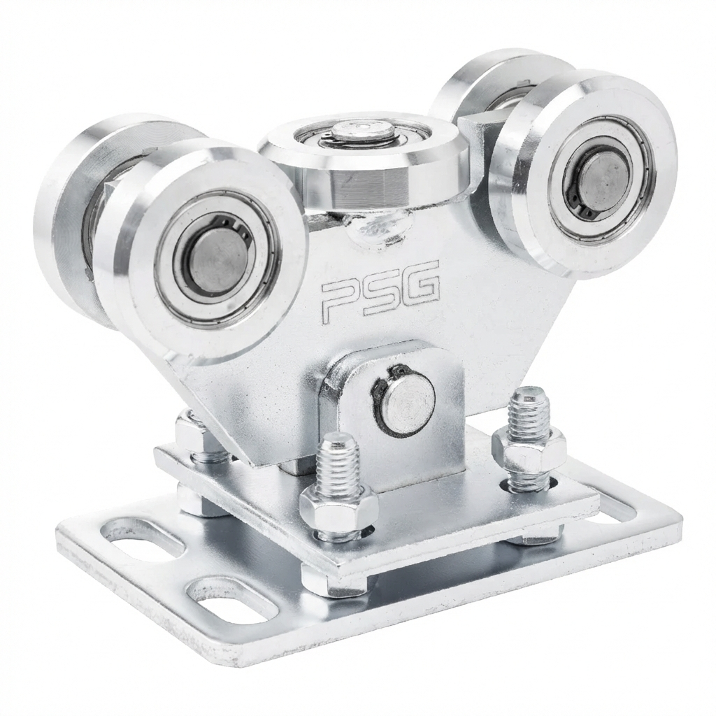Liukukärry on varustettu 5 metalliisella rullalla, joista yksi on vaakarulla, joka tarjoaa lisävakautta portin ohjaukseen. Heilurirakenne – kärry on yhdistetty alustaan tapilla, jolloin se mukautuu automaattisesti liukuportin kiskoon. Korkeudensäätö ruuveilla mahdollistaa portin tarkan asennon säätämisen asennuksen aikana.