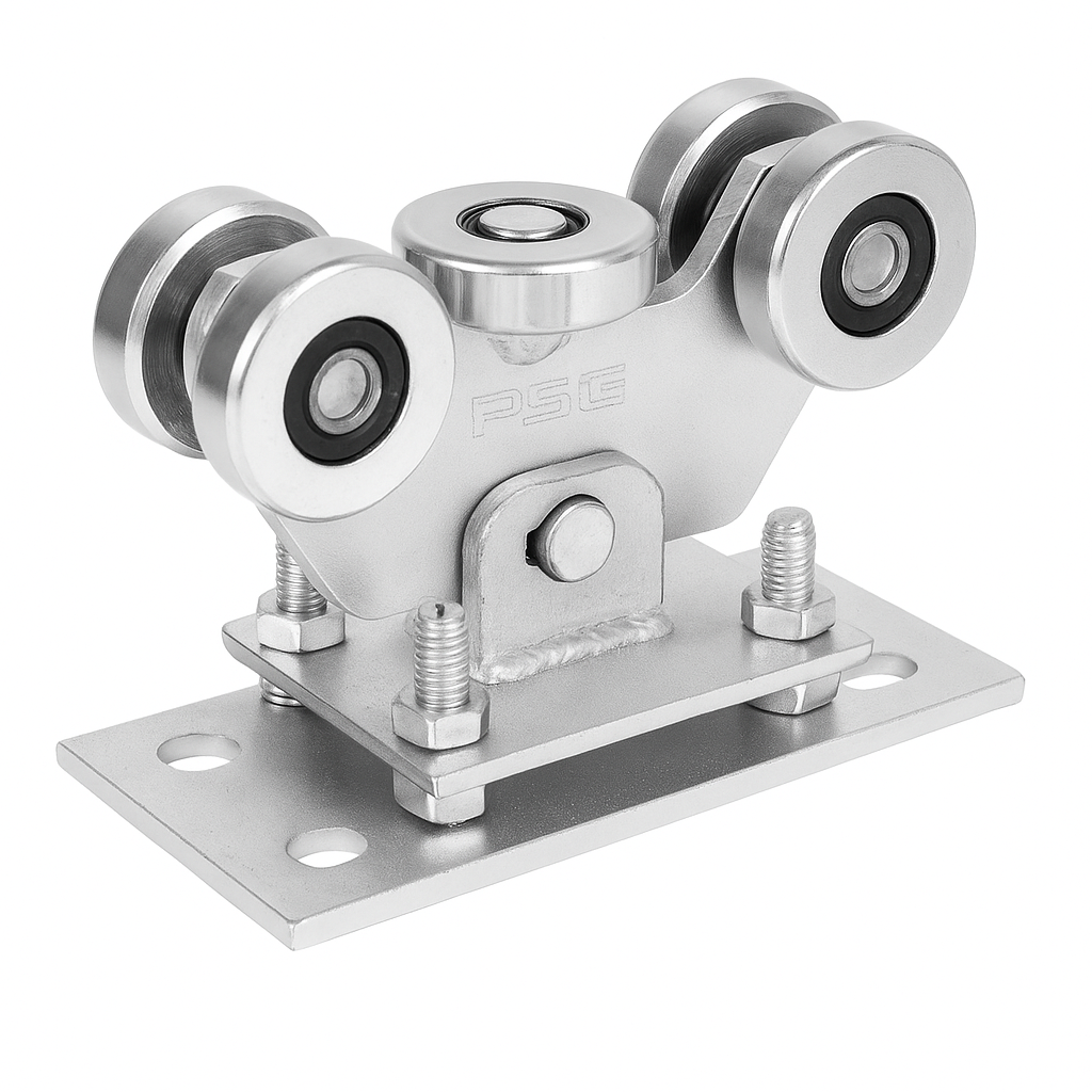 5-metallirullaisella pyörävaunulla on keskeinen rooli kokonaisuudessa. Heiluri-rakenne — vaunu on yhdistetty alustaan tapilla, jolloin se mukautuu automaattisesti liukuportin kiskoon. Neljä pystysuoraa rullaa ohjaa kiskoa sivuilta, ja yksi vaakasuora rulla ottaa vastaan pystysuoran kuorman. Säädettävä korkeus kiinnitysruuvien avulla mahdollistaa portin tarkan asennon. Sinkitty viimeistely takaa korroosionkestävyyden ja pitkäaikaisen käytön ulkotiloissa.