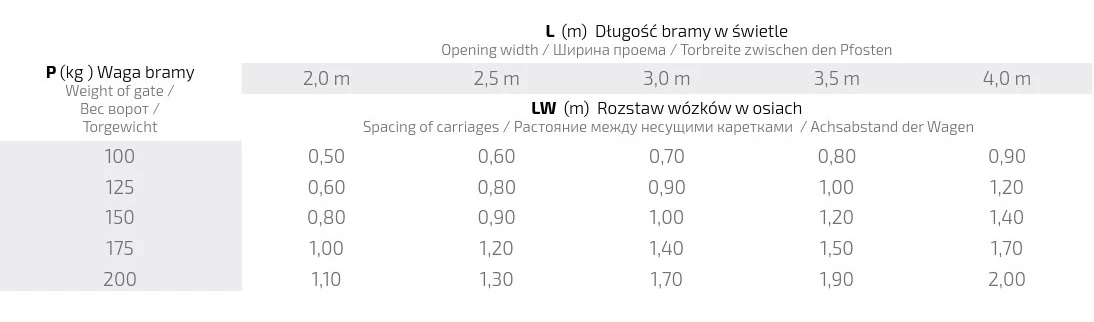 Yllä oleva taulukko esittää suositellun pyörävaunujen akselivälin (LW) metreinä portin painon (P) ja portin vapaan aukon leveyden (L) mukaan. Oikea jakovälin valinta on keskeistä kuormien tasaisen jakautumisen ja koko liukujärjestelmän kestävyyden kannalta: