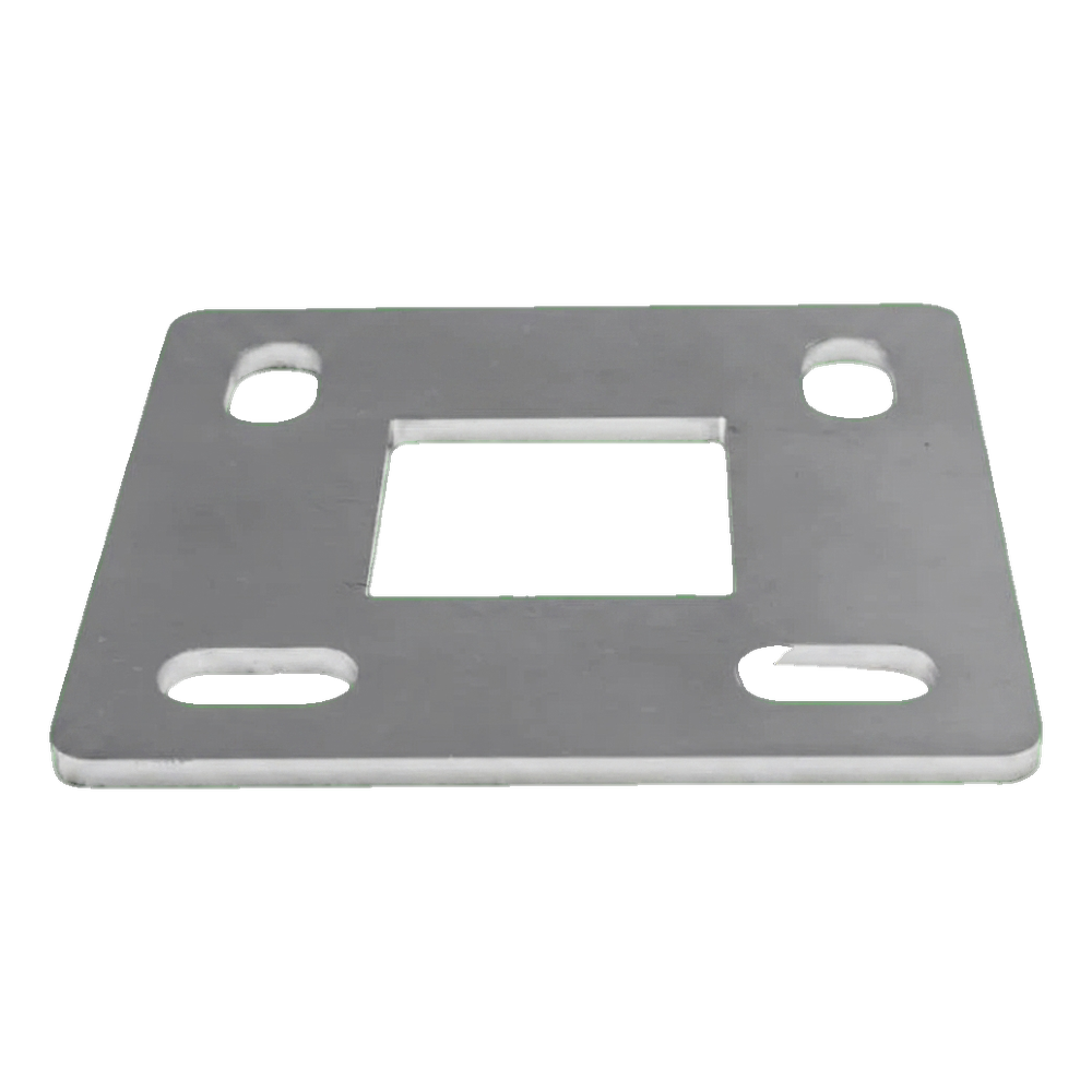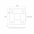 Neljä soikeaa kiinnitysreikää (9×20 mm) takaa joustavuuden kiinnitettäessä alustaan — ruuvien asennon säätö helpottaa pilarin tarkkaa asettelua myös epätasaisilla pinnoilla. Keskireikä 40×40 mm on sovitettu standardin nelikulmaisten profiilien järjestelmään, mikä takaa yhteensopivuuden suosittujen kaidepilarien kanssa.