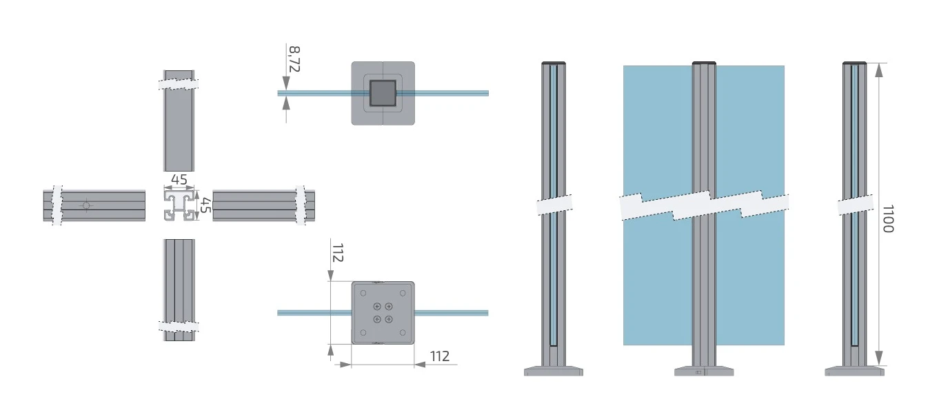 45 × 45 mm poikkileikkauksellinen profiili sisältää pituussuuntaisen uran, joka on tarkasti sovitettu 8,72 mm paksuiselle lasille (turvalaminaatti 2 × 4 mm + PVB-kalvo). Profiilin siromähkö, geometrinen muoto takaa rakenteen vakauden säilyttäen koko kaiteen visuaalisen keveyden.