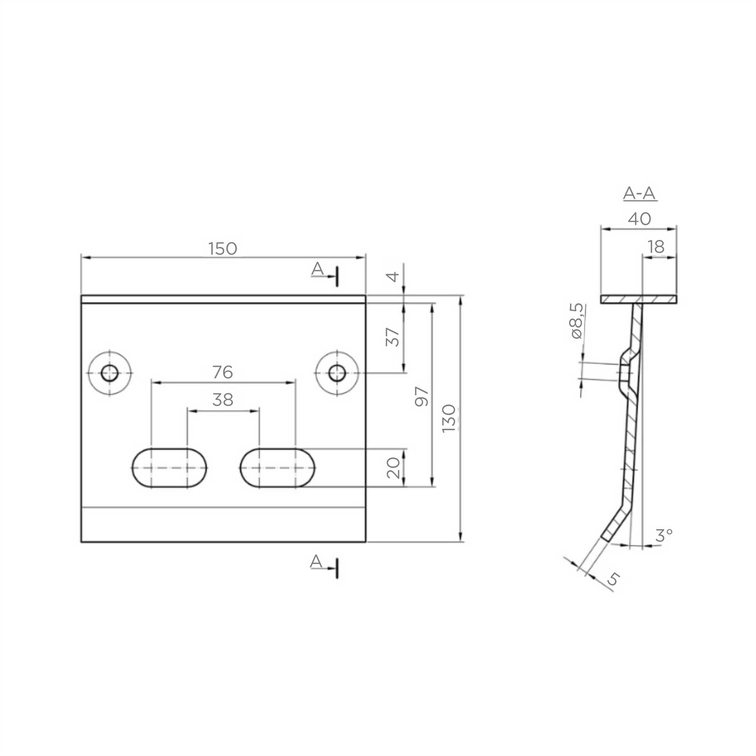 Kiinteä rakenne 5 mm paksuisesta teräslevystä takaa mekaanisen kestävyyden, ja harkittu profiili taivutuksineen varmistaa jäykkyyden ja vakauden asennuksen jälkeen. Kaksi pyöreää reikää (Ø 8,5 mm) ruuvaa pysäyttimen lattiaan, kun taas kaksi soikea reikää mahdollistavat salvan asennuksen asennon säätömahdollisuudella.