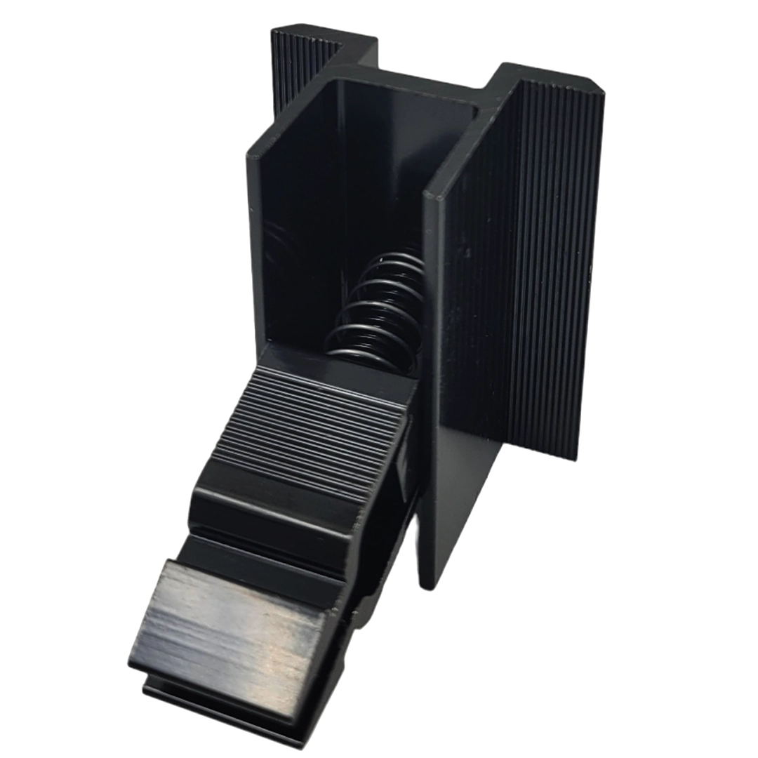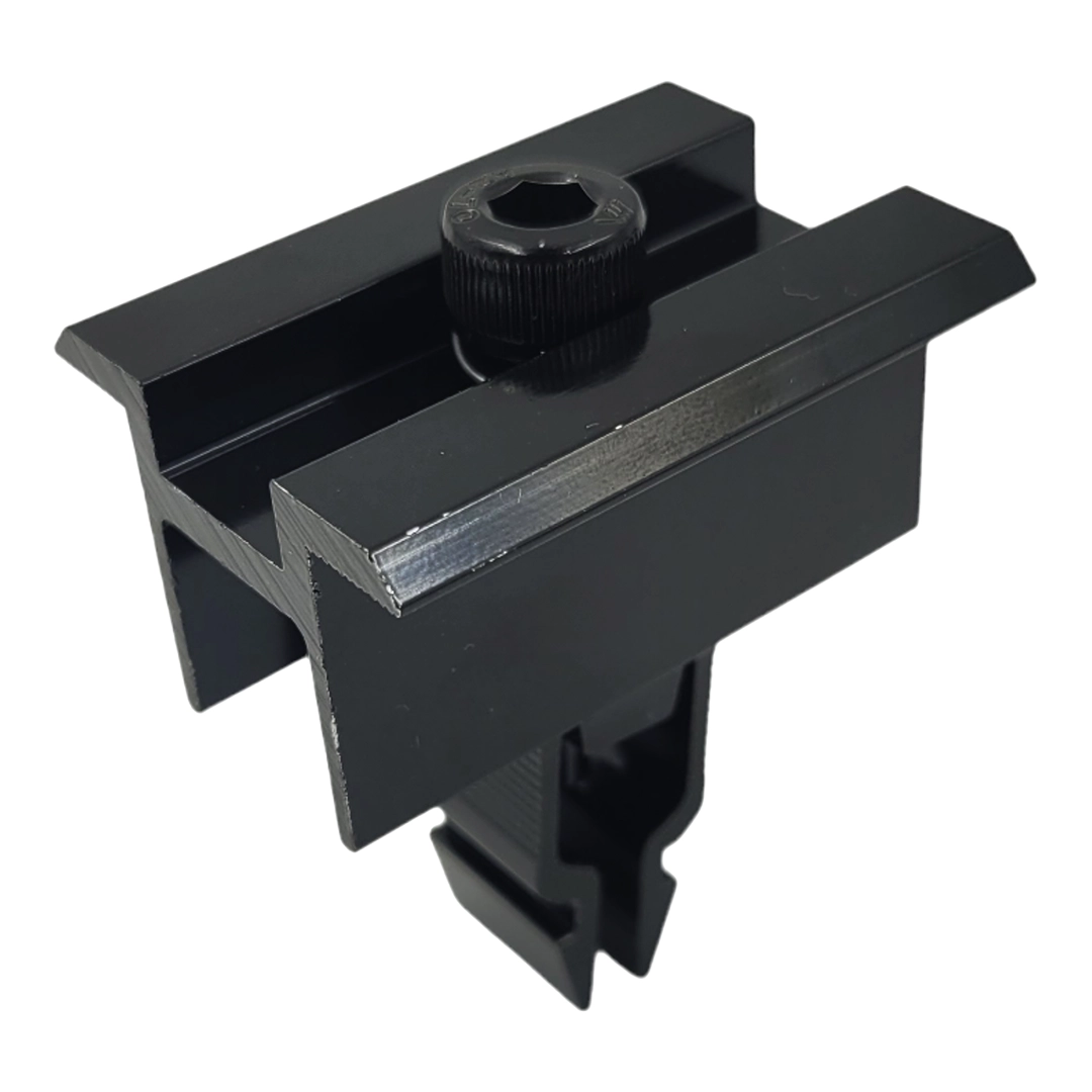 Keskipainekiinnike alumiinista 6060 musta - Mustaksi maalattu L50 (tyyppi 2), mutterilla ja pultilla varustettu napsautussalpa aurinkosähkömoduulien kiinnittämiseen.