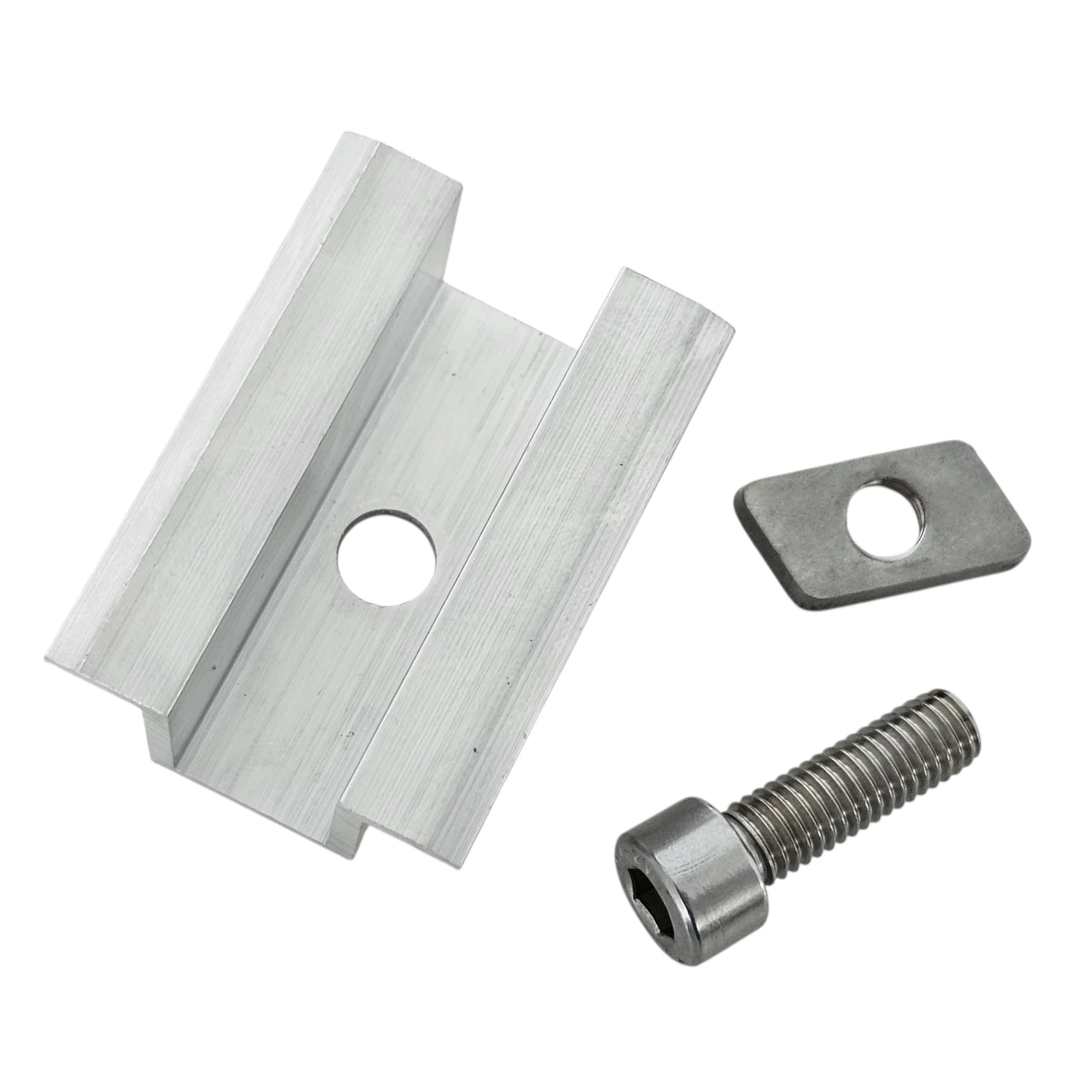 Keskimmäinen puristin H25 L50, M8x20-ruuvilla ja 6060-alumiinista valmistetulla insersiolla, 30 mm:n aurinkopaneelien asennukseen DIN 912 -ruuveilla.
