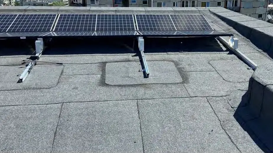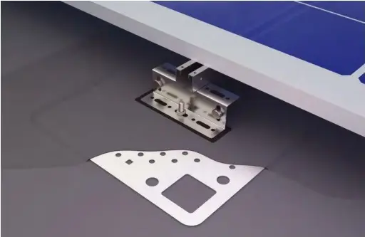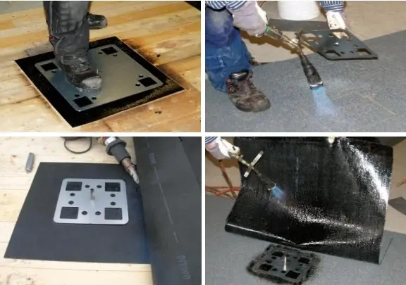 2. Aseta ruuvi levyn alle sille tarkoitettuun reikään ja hitsaa asennuslevy leikatun kattokalvon palan keskelle.