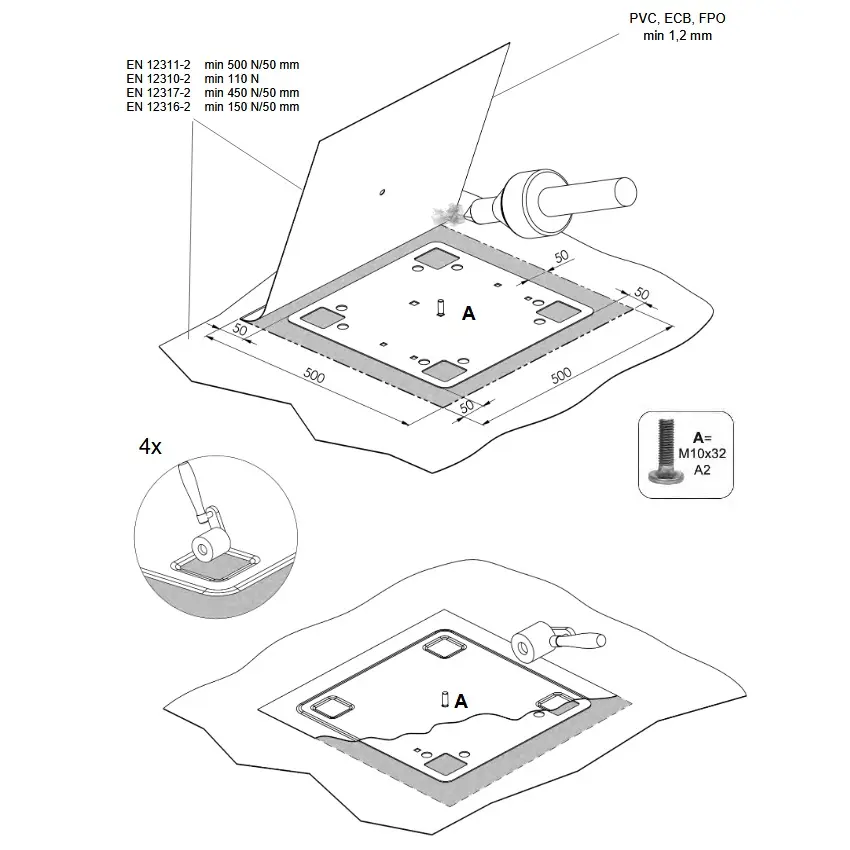 1. Leikkaa kattokalvosta pala, jonka koko on 500 x 500 mm. (Katon uusinnassa kiinnityslevy voidaan hitsata vanhan ja uuden kattokalvon väliin. Tällöin ei tarvita erillistä 500 x 500 mm:n kattokalvon palaa).