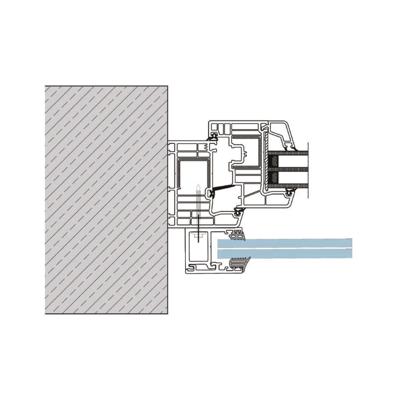 Poikkileikkauskuva näyttää alumiiniprofiilin liitoksen yksityiskohdan ikkunakehyksen ja karmirakenteen kanssa. Profiili kiinnitetään suoraan ikkunaan — puuttumatta seinärakenteeseen. Järjestelmä varmistaa esteettisen viimeistelyn ulkopuolelta peitelistojen ja lasitiivisteen ansiosta.