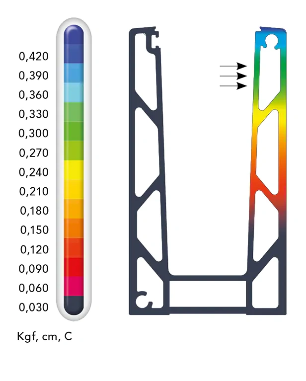 Elementtimenetelmällä (FEM) suoritetun siirtymäanalyysin tulokset vahvistavat rakenteen korkean jäykkyyden. Simulaatio suoritettiin profiilille, jonka perustan pituus on 1 m, vaakasuuntaisella kuormituksella alle 500 kg (5000 N), perustasta profiilin korkeimpaan pisteeseen. Maksimisiirtymä profiilin yläreunassa pysyy sallituissa rajoissa (arvoskaala 0,030–0,420 Kgf, cm, C), mikä takaa kaiteen turvallisen käytön.