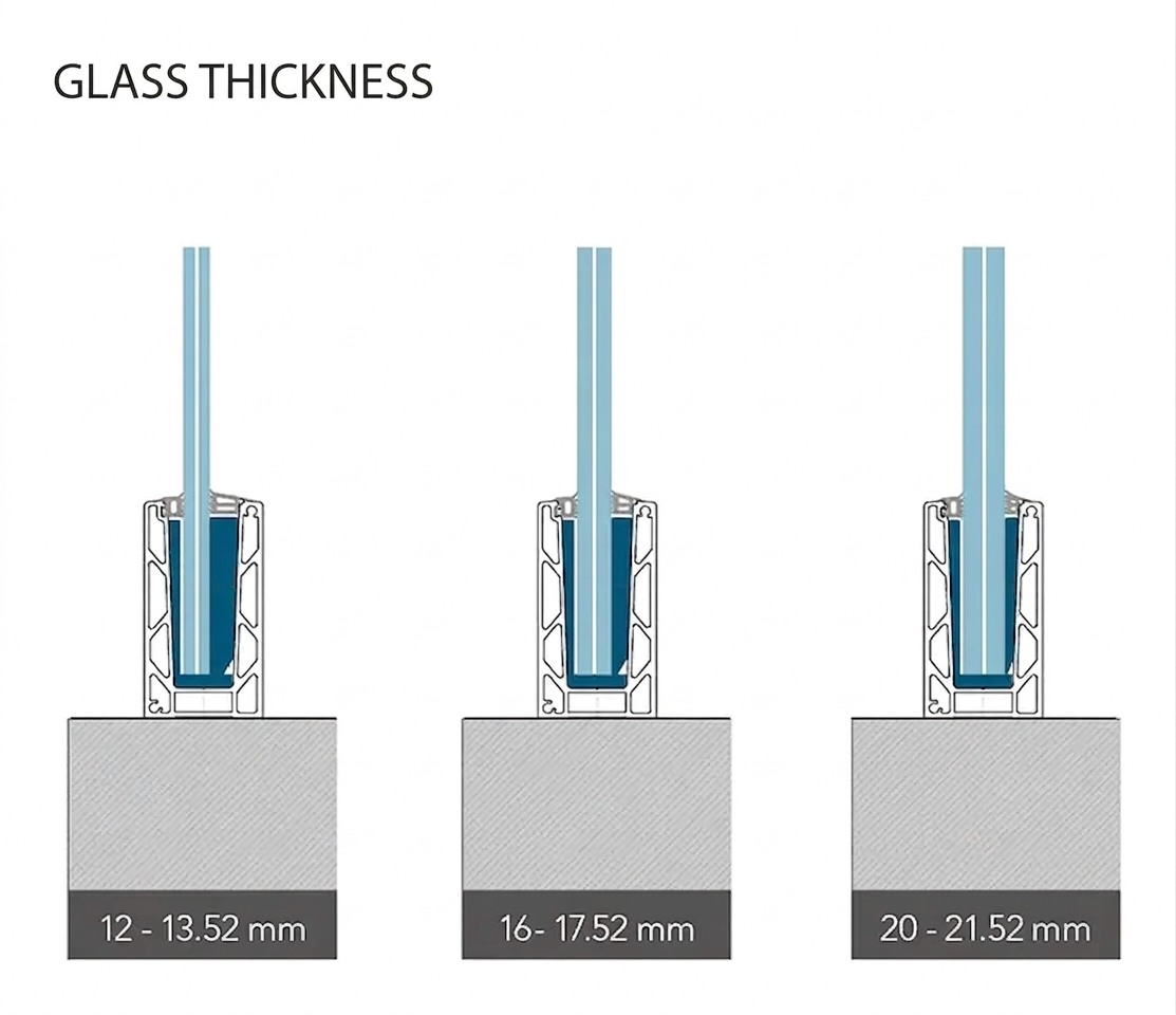 Profiili KE 100 tukee kolmea lasilevyjen paksuusaluetta, mikä mahdollistaa ratkaisun sovittamisen projektin vaatimuksiin ja voimassa oleviin turvallisuusstandardeihin: