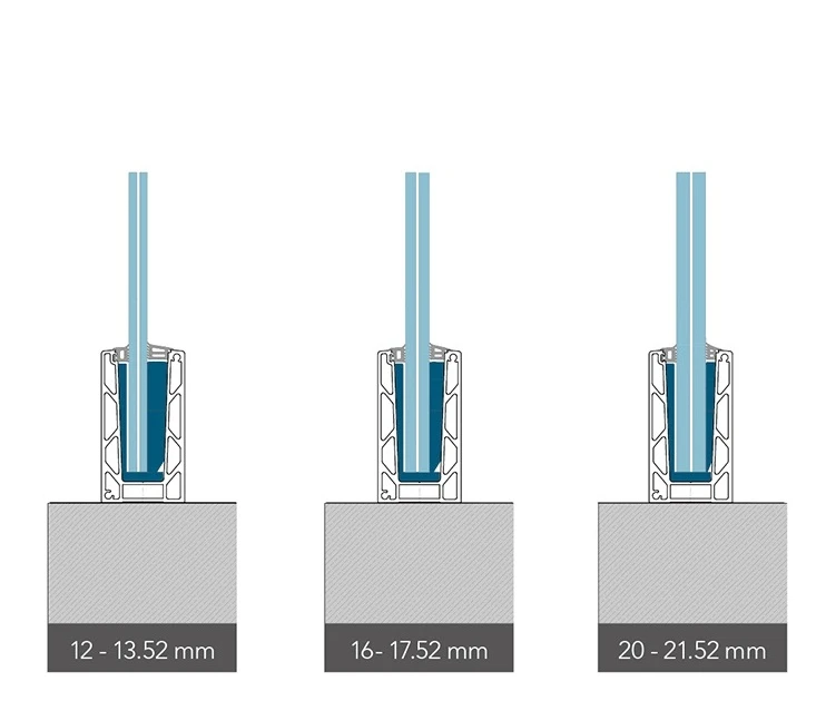 KE 100 profiili käsittelee kolme lasin paksuusaluetta, mikä takaa käytön monipuolisuuden: