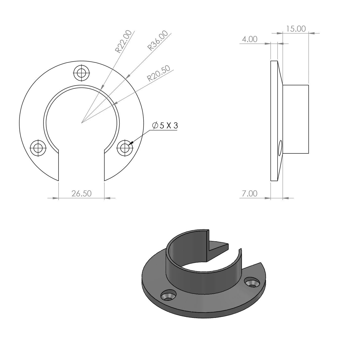 - Alustan (laipan) ulkoinen säde: R 36 mm (alustan halkaisija 72 mm)