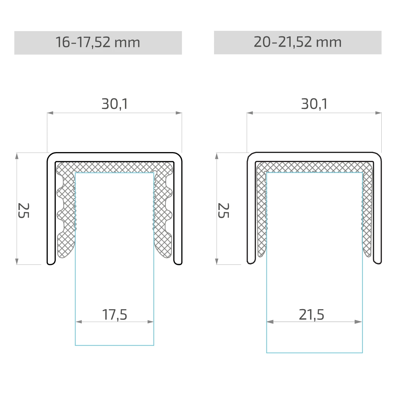 Käsijohde toimii kahden tyyppisen vaihdettavan tiivisteen kanssa, mikä mahdollistaa sen asentamisen eri paksuisille laseille. 16–17,52 mm lasille käytetään tiivistettä, joka mukautuu asennusrakoon 17,5 mm, kun taas 20–21,52 mm lasille käytetään tiivistettä, joka laajentaa sitä 21,5 mm:iin. Tällainen joustavuus poistaa tarpeen tilata erilliset profiilit eri projekteihin.