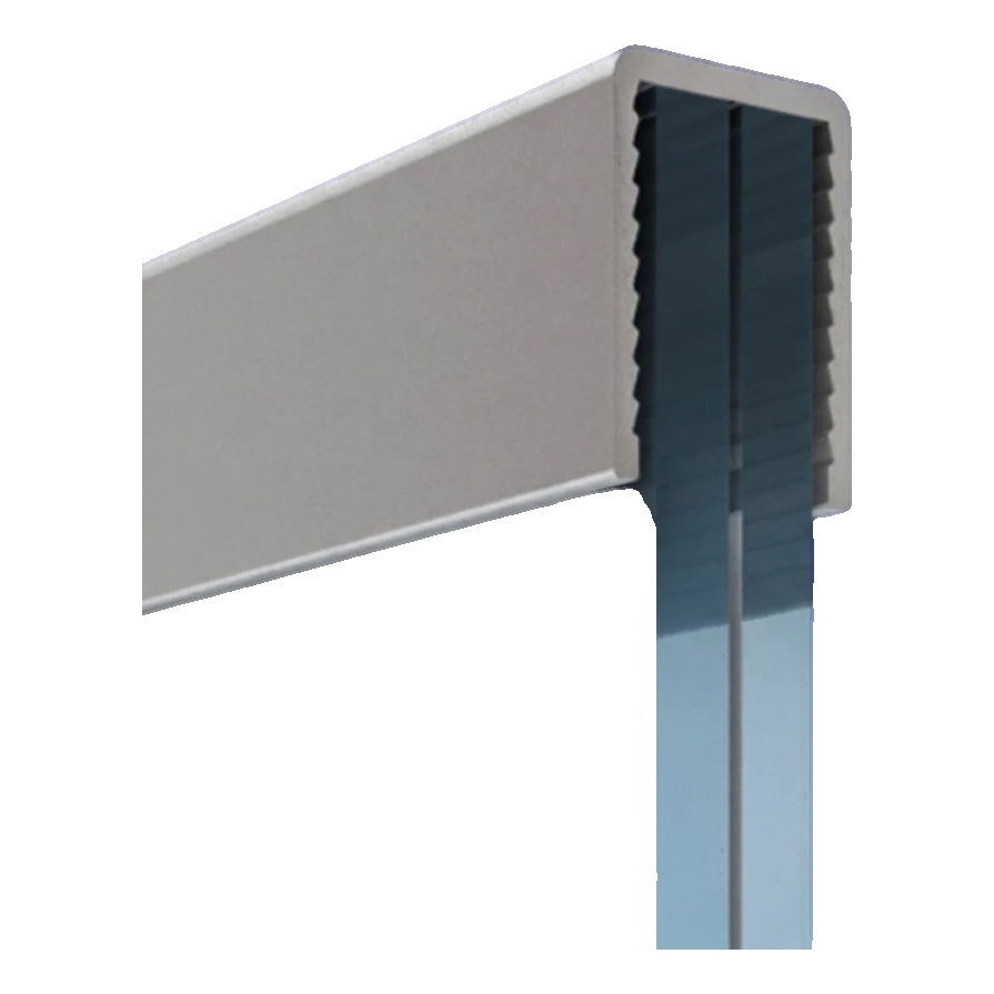 Profiilin sisäseinissä on hammastettu rakenne, joka vakauttaa kaiteen lasin reunaan liiman tai silikonin levityksen jälkeen. Porauksen eliminointi tarkoittaa lasilevyn heikentymispisteiden puuttumista ja pienempää särkymisriskiä — keskeinen etu työskenneltäessä karkaistun ja laminoidun lasin kanssa. Lopputulos on sileä, ammattimainen käsijohtolinja ilman näkyviä liitoksia.