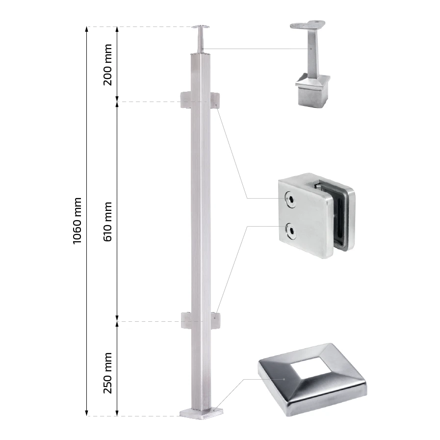 Kulmakaide-pystyputki ruostumaton teräs 40×40×1060 mm – 4 lasipitimiä
