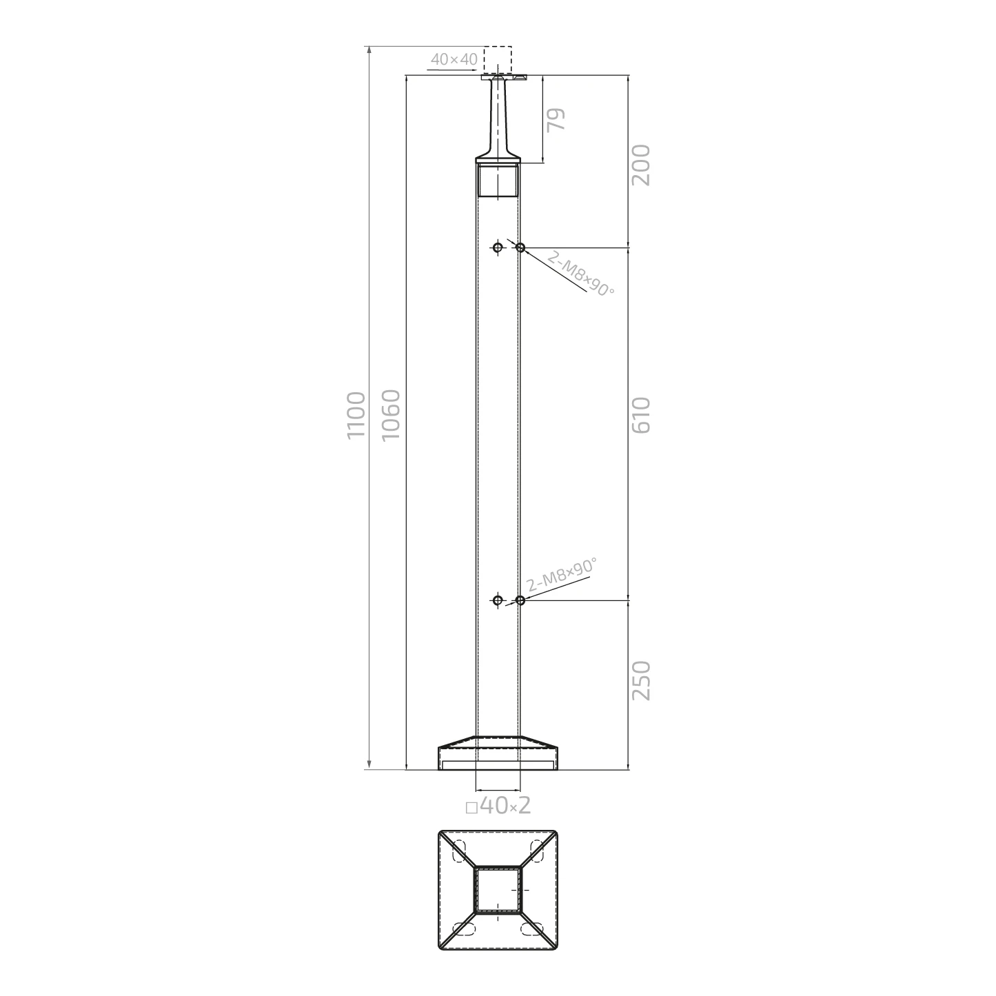 Kulmakaide-pystyputki ruostumattomasta AISI 304 teräksestä, profiili 40×40 mm ja korkeus 1060 mm (käsijohtotuen kanssa yhteensä 1100 mm). Tarkoitettu lasikaiteiden rakentamiseen – parveke- ja portaikkokaiteisiin – käyttäen karkaistua tai laminoitua lasia. Satiinipinta antaa pystyputkelle modernin, elegantin ulkonäön, joka sopii erinomaisesti sekä sisä- että ulkotiloihin.