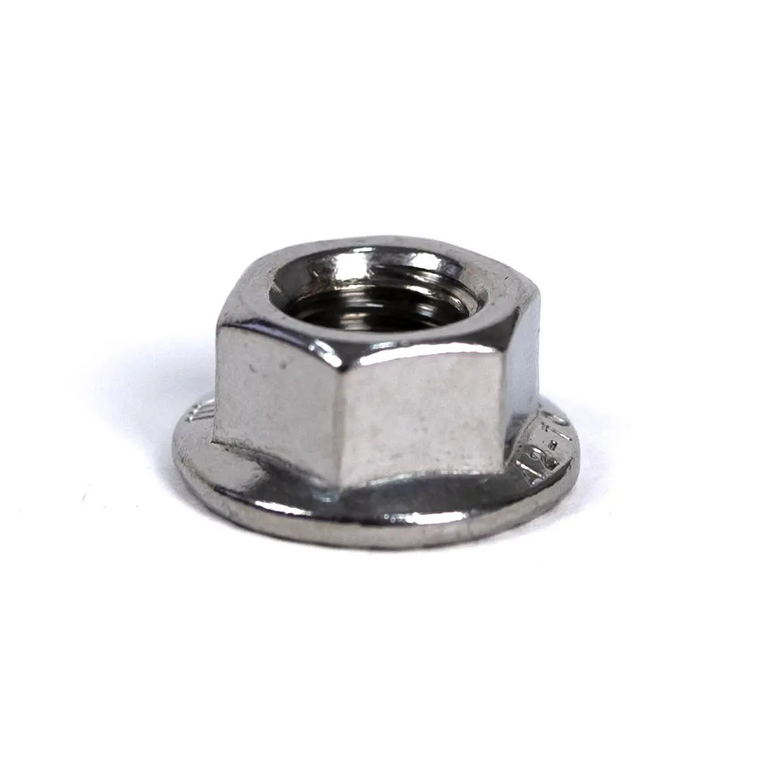 Kuusikulmainen laippamutteri DIN 6923, jossa on hammastettu laippa, M10, ruostumatonta terästä A2 1.4301, aurinkosähköjärjestelmään.