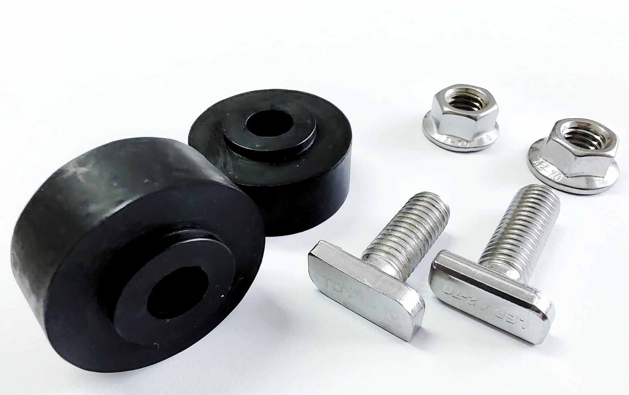 Täydellinen asennustarvikesetti Jokaisen alustaparin mukana toimitamme vasarapultit, mutterit sekä erikoiset EPDM-kumiset tärinäneristysaluslaatat. EPDM-kumi vaimentaa tehokkaasti tärinää ja vähentää ympäristöön siirtyvää melua – tärkeä etu asennettaessa asuintilojen läheisyyteen.
