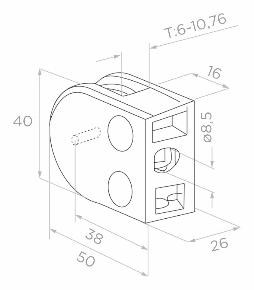 Lasipidin 50×40×26 mm ruostumattomasta teräksestä AISI 316 satiiniviimeistelyllä — luotettava ratkaisu lasipaneelien kiinnittämiseen tasaisille pinnoille. Tuote on suunniteltu ammattikäyttöön kaiteissa, suojuksissa ja lasirakennelmissa, joissa vaaditaan korkeaa korroosionkestävyyttä sekä esteettistä, modernia ulkonäköä.