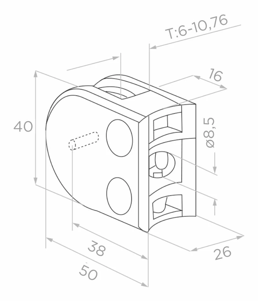 Pidin sopii 6–10,76 mm paksuiselle lasille, mikä kattaa sekä yksinkertaisen karkaisun että laminoidun turvalas VSG:n. Kiinnitys tapahtuu ruuvaamalla pidin putkeen, ja kaksi kuusiokoloruuvia mahdollistaa lasin puristuksen tarkan säädön ilman koko elementin irrottamista. Pakkaukseen sisältyy asennustappi, joka helpottaa asennusta.