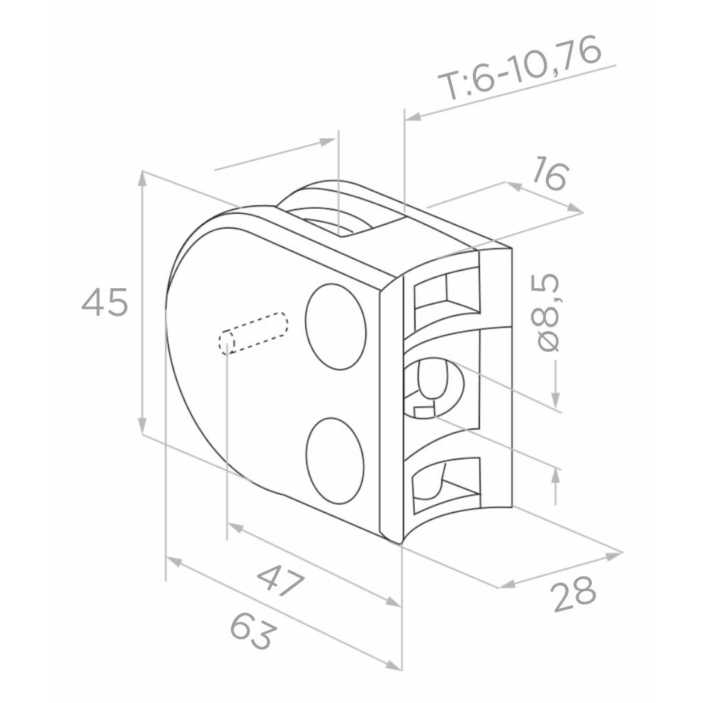 Pyöristetty lasipidin on suunniteltu Ø 42,4 mm putkeen perustuville lasikaidejärjestelmille. Se mahdollistaa 6–10,76 mm paksuisten lasilevyjen vakaan kiinnityksen varmistaen rakenteen turvallisuuden ja esteettisen ulkonäön. Pakkaukseen sisältyy turvatapin, joka estää lasin tahattoman irtoamisen pidikkeestä.