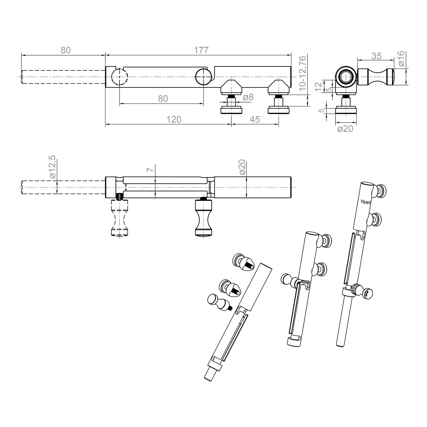 Tekninen piirustus esittää salvan täydelliset mitat asennusyksityiskohtineen. Salpatanko halkaisijaltaan ø12,5 mm työntyy ulos 80 mm matkalla rungosta, varmistamaan maiton luotettavan lukituksen. Käyttökahva halkaisijaltaan ø16 mm ja pituudeltaan 35 mm mahdollistaa mukavan yhden käden käytön. Kaksi kiinnityspistettä 45 mm akselijaolla ja koristeelliset kapselit ø20 mm takaavat vakaan, esteettisen asennuksen lasitaululle.