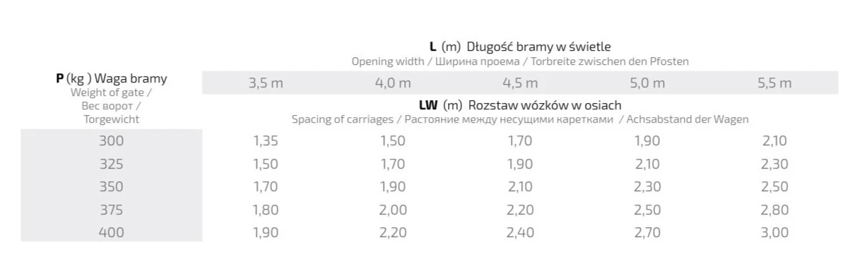 Oikea vaunujen akselijako riippuu portin painosta ja portin vapaasta leveydestä. Alla oleva taulukko helpottaa valintaa: