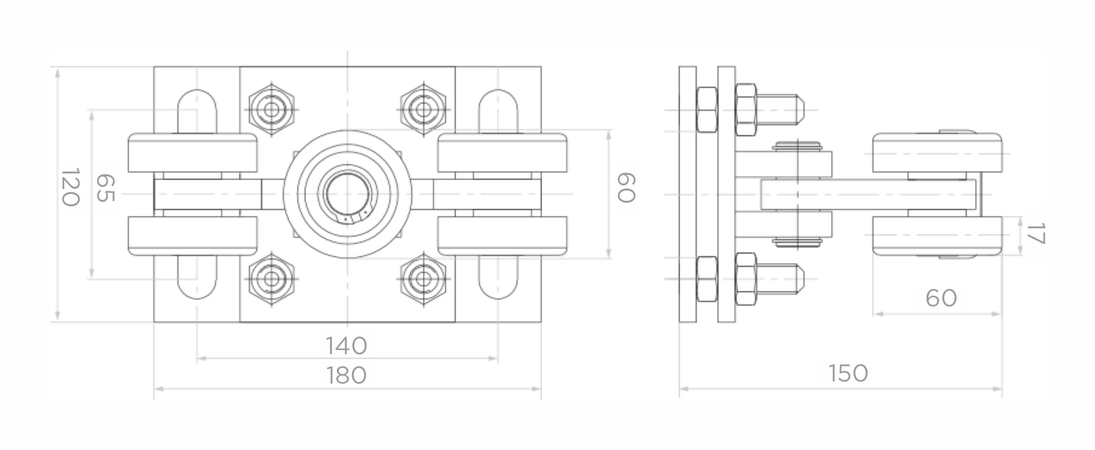 Kärryt on varustettu 5 teräsrullalla, joista yksi on vaakarulla, ja ne toimivat yhdessä 70×70×4 mm -ohjauskiskon kanssa. Kaikki rullat on asennettu kuulalaakereiden varaan, mikä takaa alhaisen vierintävastuksen ja hiljaisen käynnin. Heiluva mekanismi mahdollistaa kärryn kallistumisen asennusalustaan nähden — tämä kompensoi pienet epätasaisuudet ja kiskon taipumat sekä jakaa kuorman tasaisesti kaikille rullille.