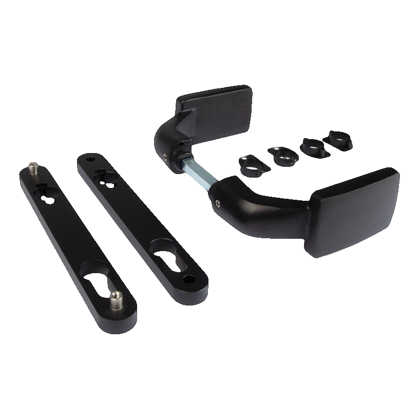 Ergonominen kahva on erityisesti suunniteltu estämään käden hankautuminen pylvään vastinlevyä vastaan — tämä on tärkeä etu intensiivisessä käytössä kaupallisissa ja teollisissa kohteissa. Sarjassa on kaksi asennuskilpeä, pari vetimia, yhdistävä tappi sekä kiinnityspultit siipimuttereilla, mikä takaa nopean ja ongelmatonta asennuksen.