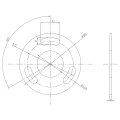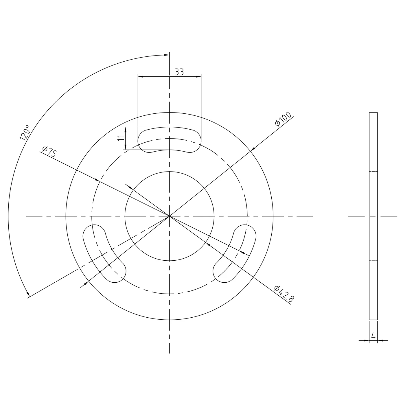 - Asennusreiät: 3 soikea reikää (33 × 11 mm) jakoympyrällä Ø75 mm, sijoitettuna 120° välein