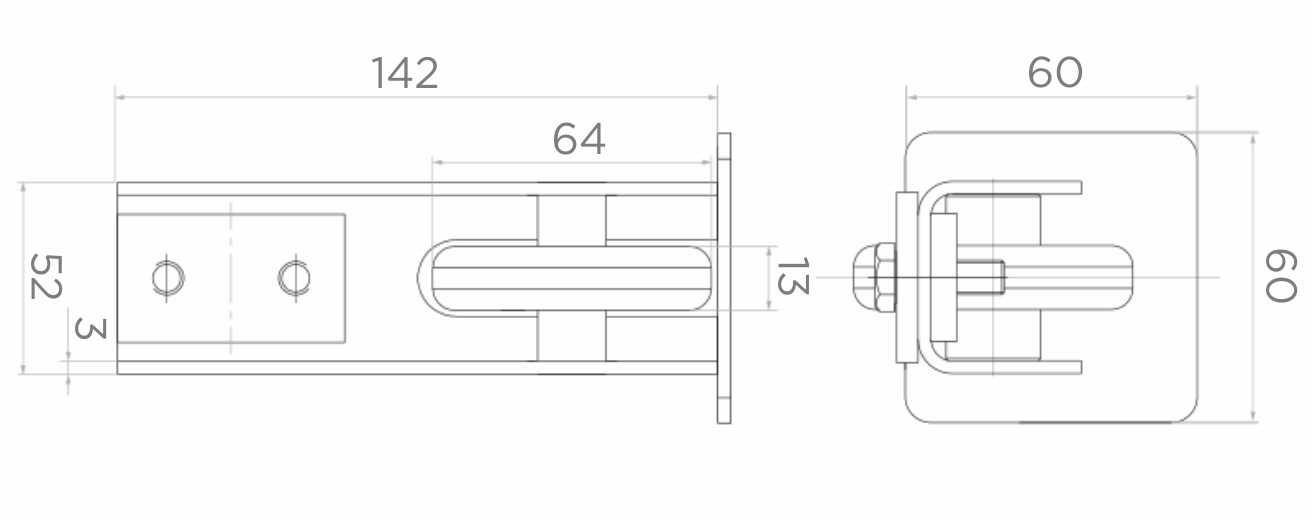 - Yhteensopivuus kiskon kanssa: 60 × 60 × 3 mm