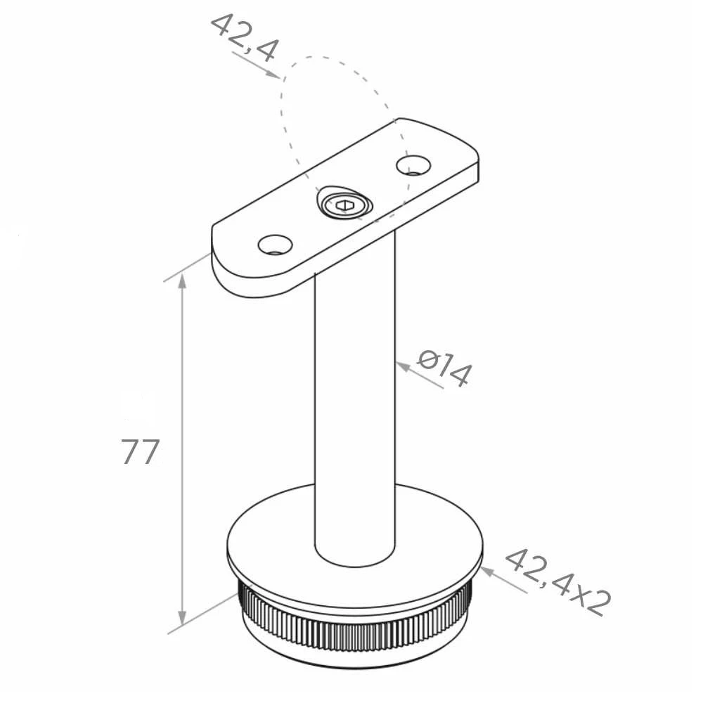 Tuen rakenne on sovitettu 42,4 mm kaidejärjestelmään. Alaosa rihloidulla reunalla lyödään pylväsputkeen koossa 42,4 × 2 mm (ulkohalkaisija × seinämän paksuus), ja ylempi satula profiloidulla kaarevuudella sopii 42,4 mm halkaisijaltaan olevaan käsijohteeseeseen. Pystysuora ø14 mm tappi varmistaa koko liitoksen riittävän jäykkyyden.