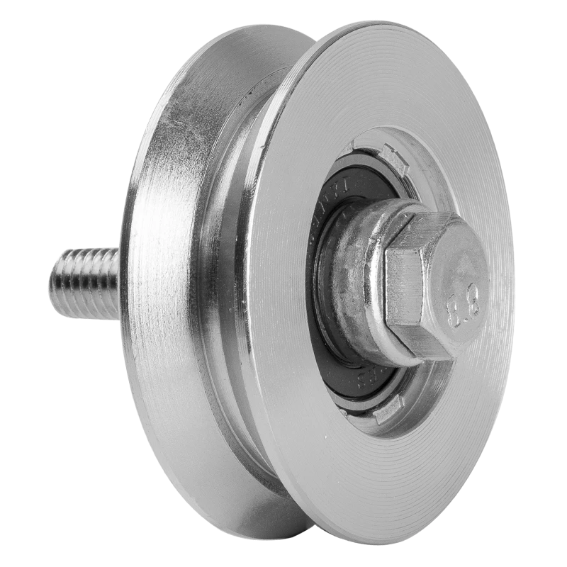 Rulla on tarkoitettu yhteistyöhön V-profiilisten ohjainraiteiden kanssa — standardiratkaisu kiskoilla varustetuissa liukuporteissa. V-uran profiili varmistaa portin vakaan ohjauksen kiskoa pitkin ja minimoi sivuttaispoikkeamat lehden liikkuessa. 150 kg kantavuus mahdollistaa käytön kohtuullisen painoisissa porteissa — sekä omakotitalojen asennuksissa että kevyissä teollisuusporteissa.