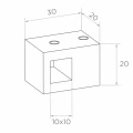 Kiinnikkeen rakenne mahdollistaa nopean läpimenevän asennuksen — tanko kulkee 10×10 mm reiän läpi, ja kokonaisuus kiinnitetään pintaan kahden kiinnitysreiän avulla yläreunassa. Kompaktit ulkomitat (30×20×20 mm) tekevät elementistä huomaamattoman eikä se visuaalisesti hallitse valmista kaidetta.