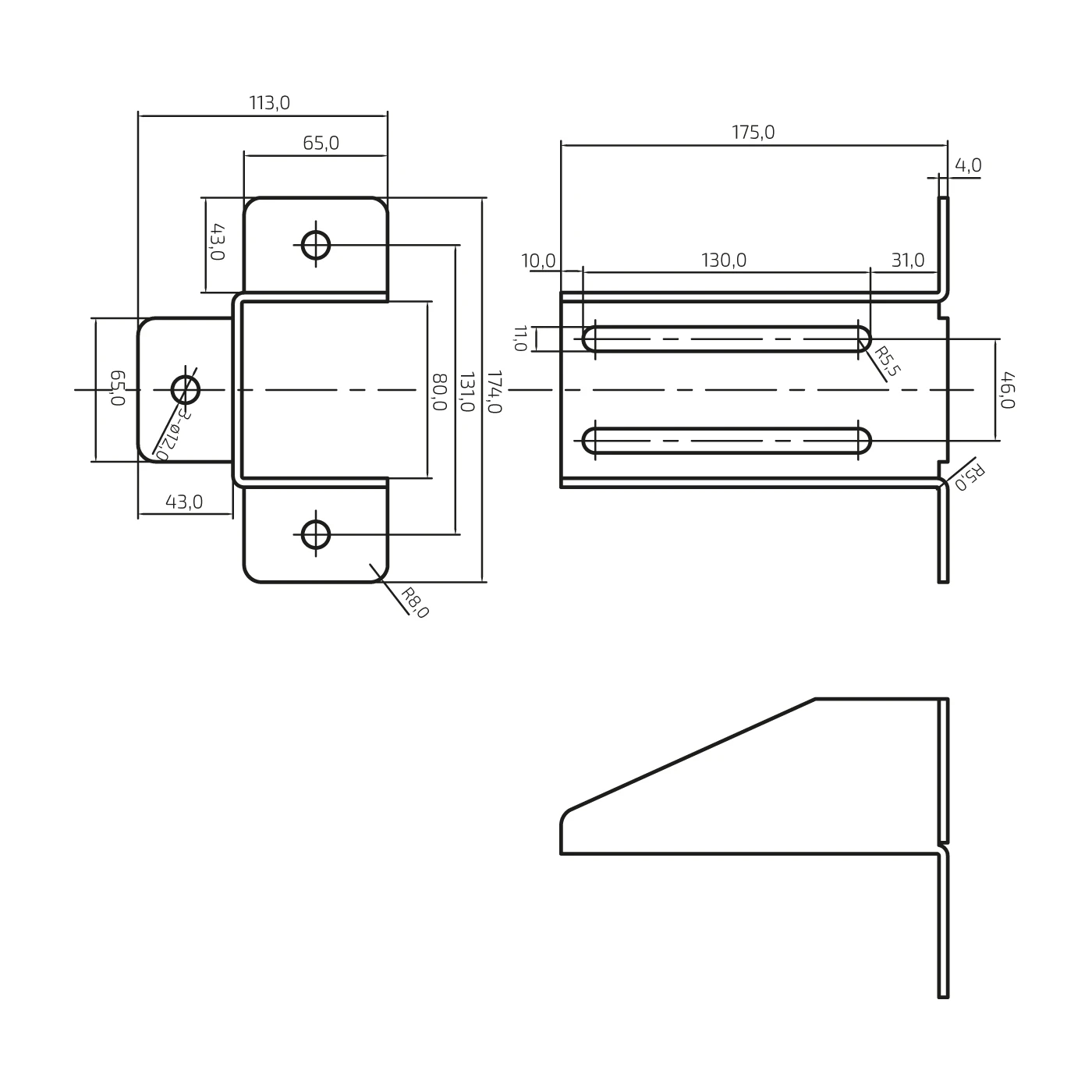 - Kiinnitysreiät: 3 × ⌀12 mm (sivulaippoissa)