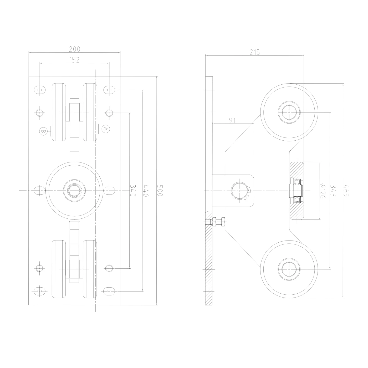 PSG liukuportin ajopyörästö 5-pyöräinen kiskolle 140 mm – teräspyörät ⌀126 mm