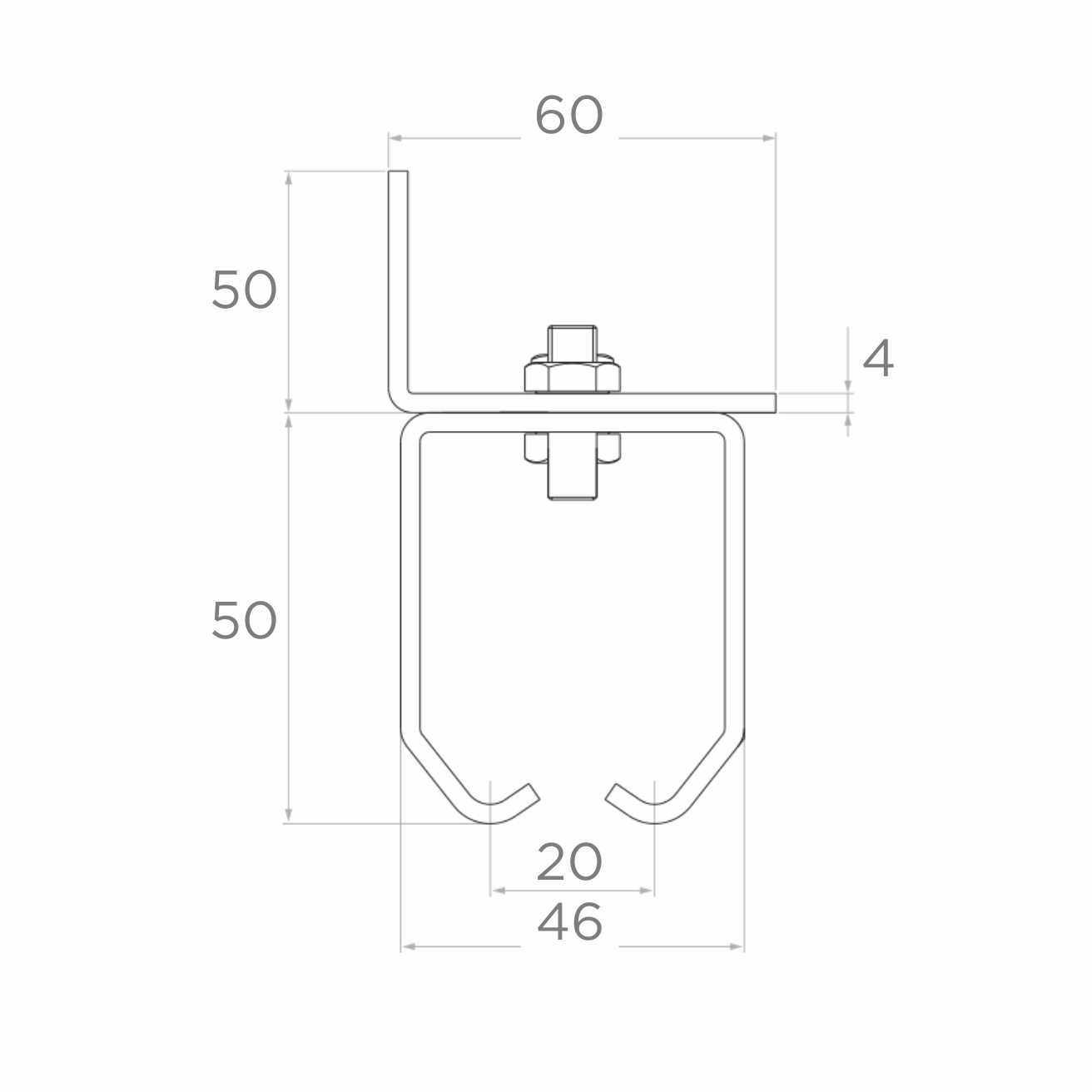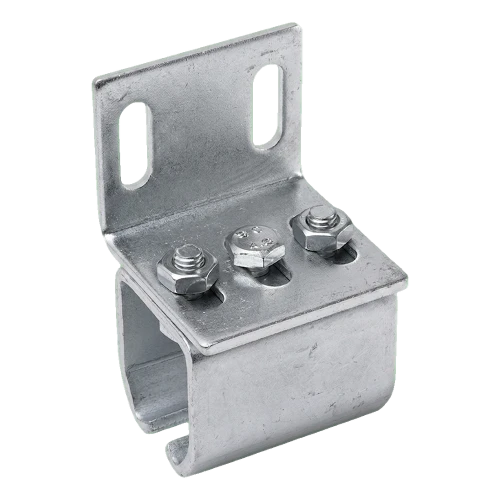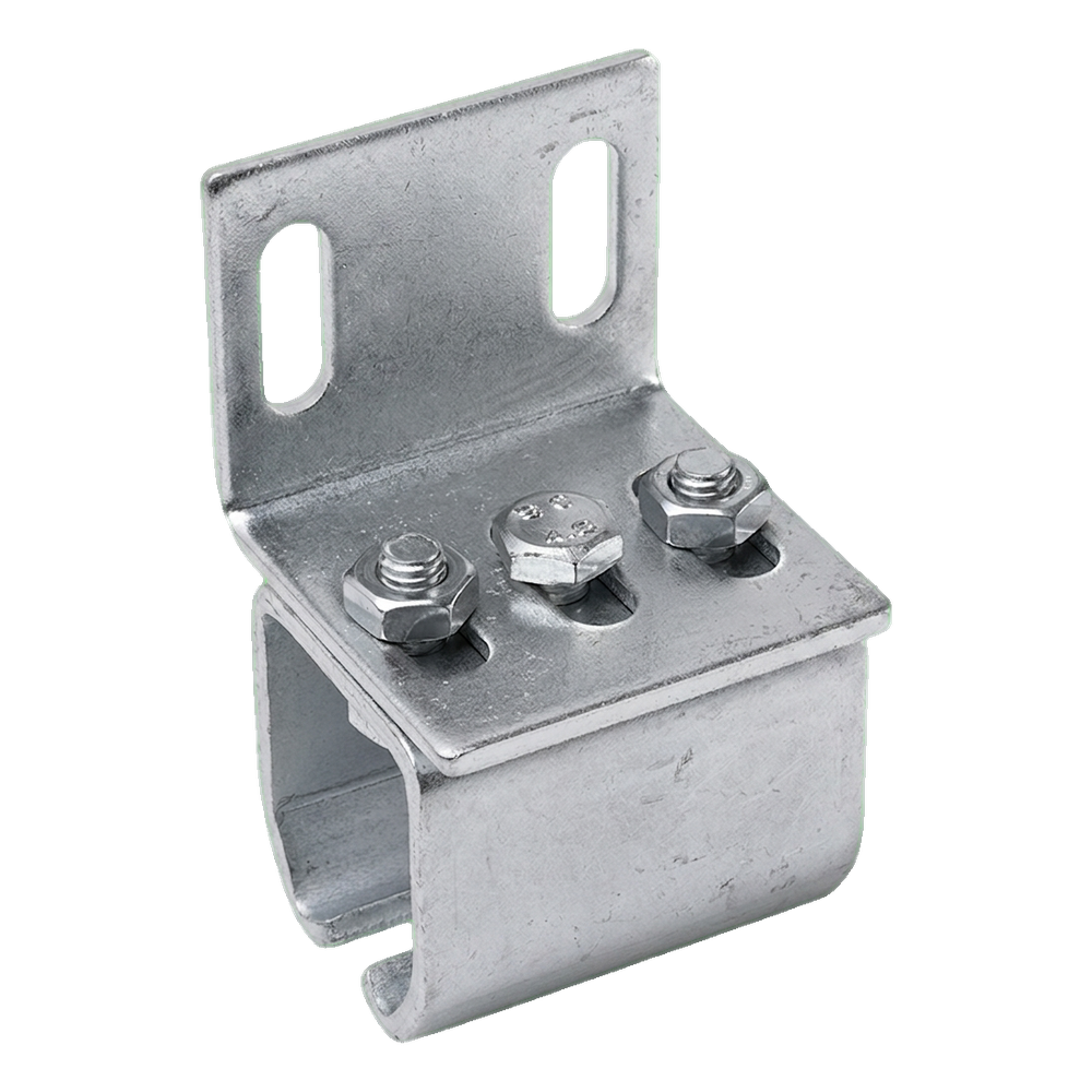 Kiinnike on tarkoitettu liukukaportin ajokiskon ripustukseen ylempään opastinjärjestelmään. Kiinnityskulmaraudassa on kaksi pitkänomaista reikää pystyvarressa, jotka mahdollistavat kiskon ripustuskorkeuden tarkan säädön sekä kiinnitysalustan epätasaisuuksien kompensoinnin. Kulmaraudan ja kiskon yhdistäminen toteutetaan mukana toimitetuilla ruuveilla — rakenne varmistaa vakaan ja jäykän kiinnityksen jopa intensiivisessä portin käytössä.