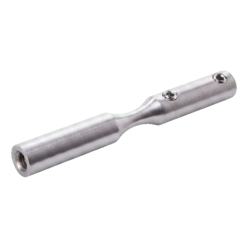 Ruostumattomasta teräksestä AISI 304 valmistettu elementti satiinipinnalla tarjoaa korkean korroosionkestävyyden ja esteettisen, hillityn ulkonäön. Asennus tapahtuu ruuvaamalla — kiinnike on varustettu M6 kierteillä ja lukitusrei'illä (Ø6 mm), mikä takaa vakaan ja kestävän liitoksen vaijerin ja kantavan rakenteen kanssa.
