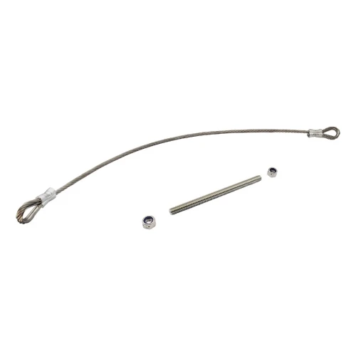 Sarja on asennusvalmis — sisältää teräsköyden tehtaalla puristetuilla silmukoilla molemmissa päissä, M12-kierretangon 180 mm pituudelta sekä kaksi M12-itselukittuvaa mutteria. Näin asentajan ei tarvitse koota erillisiä liitinelementtejä, mikä nopeuttaa työn toteutusta.