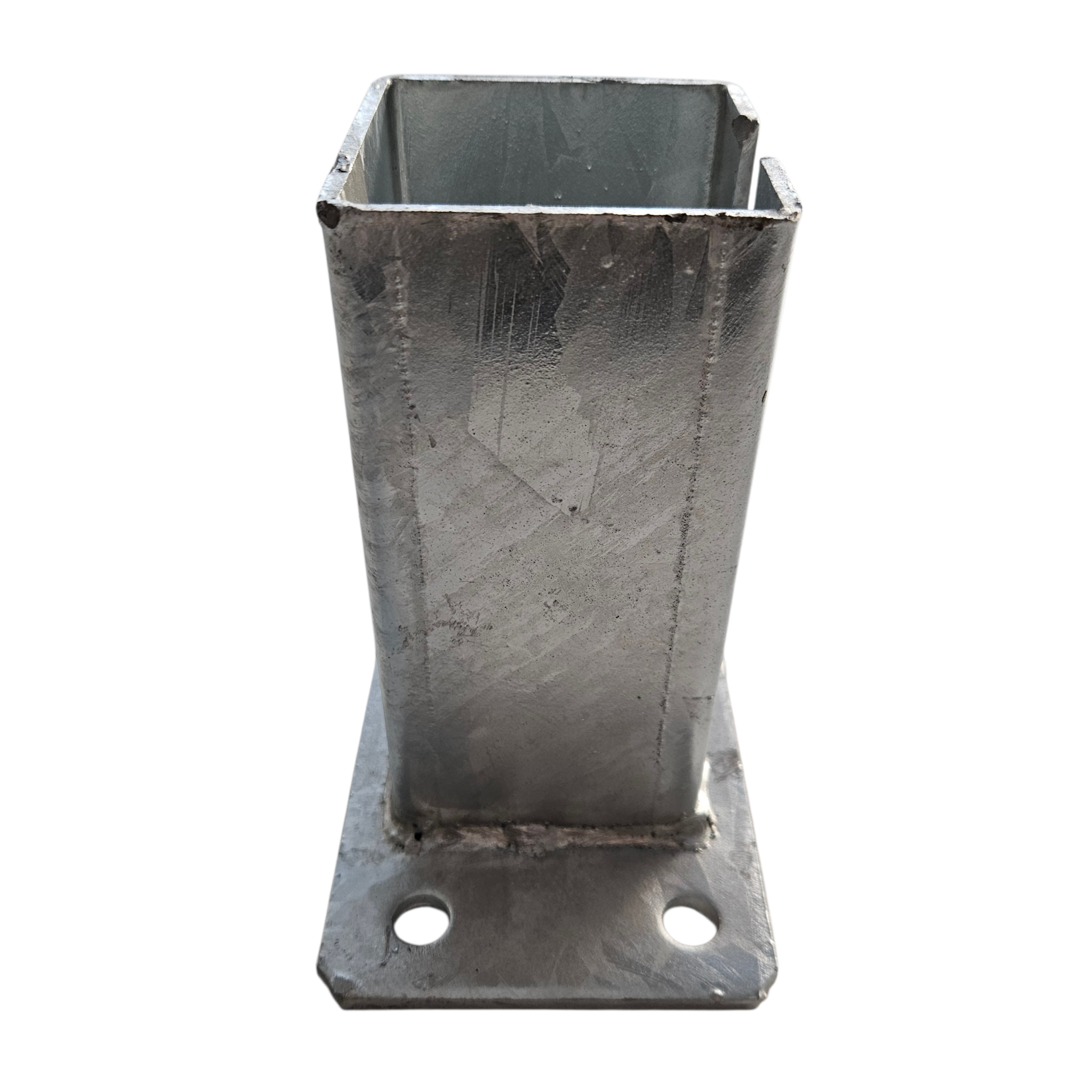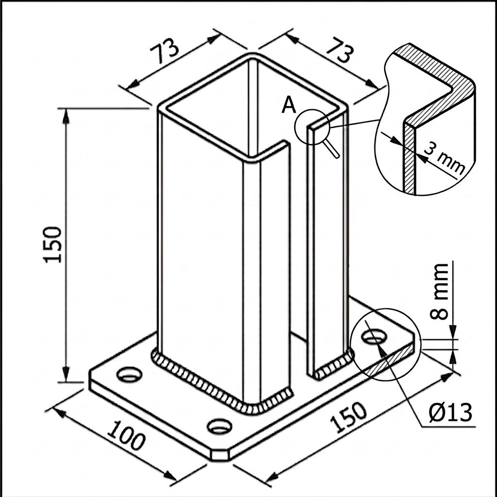 Rakenne koostuu avoimesta neliöprofiilista 73×73 mm (sopii 80×80 mm tolppaan), joka on hitsattu massiiviseen kiinnityslevyyn neljällä reiällä ankkuriruuveja varten. Profiilin pohjassa oleva kulmasauma takaa vankan kuormien siirron. Pystysuora rako profiilissa mahdollistaa tarkan sovituksen ja tolpan toleranssien kompensoinnin.
