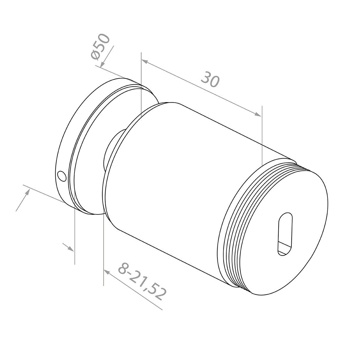 Pidin on tarkoitettu asennettavaksi tasaisille pinnoille — kiinnitetään kierrettämällä M10-kierteeseen. Lieriömäinen rakenne puristuslevyineen mahdollistaa lasin varman ja esteettisen kiinnityksen, ja mukana toimitettavat suojakumit suojaavat lasilevyä suoralta metallikosketukselta ja estävät halkeamariskin.