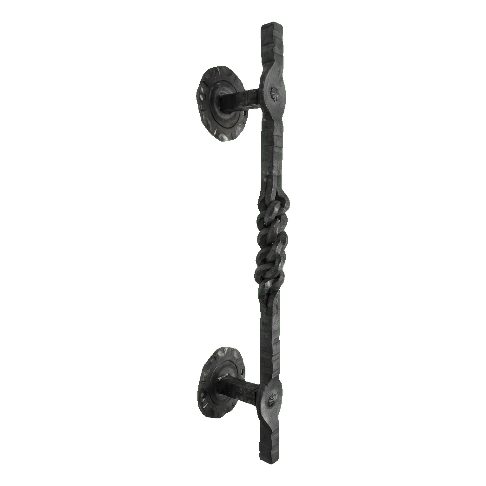 Rakenne takaa varman ja mukavan otteen, ja koristeetit asennusruusukkeet kohokuvioidulla kuviolla korostavat koko tuotteen estetiikkaa. Tuote toimitetaan raakateräsenä (ilman maalipinnoitetta), mikä mahdollistaa yksilöllisen viimeistelyn — maalauksen, patinoimisen tai sinkoituksen — kunkin toteutuksen vaatimusten mukaisesti.