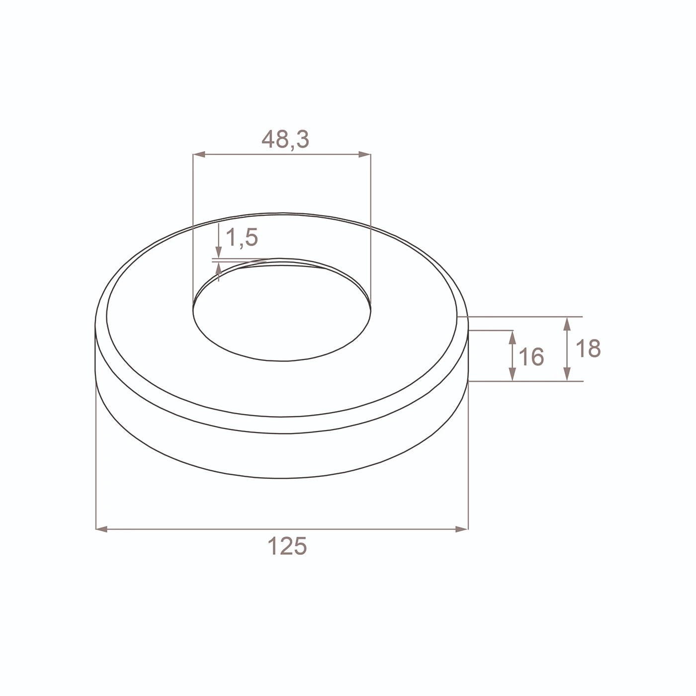 Pyöreä peitelevy 125 mm tarkoitettu 48,3 mm halkaisijan putkelle — esteettinen viimeistelyelementti, joka peittää ruostumattomien kaiteiden asennusreiät. Tarkka sovitus 48,3 mm putkijärjestelmään takaa ammattimaisen, siistin ulkonäön jokaiselle kaiderakenteelle.