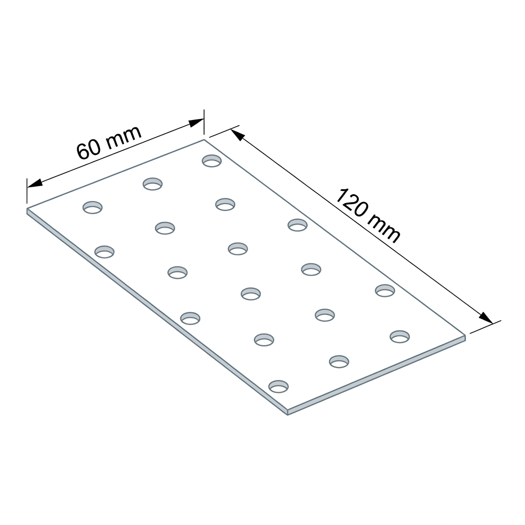 Reikälevy 60×120 mm on kestävä puusepänliitin, joka on suunniteltu ammattimaisiin puurakenneliitoksiin. 18 reiän ansiosta, joiden halkaisija on 5 mm ja jotka on sijoitettu tasaisesti levyn pinnalle, se mahdollistaa sekä yksinkertaisten että monimutkaisisten puusepänliitosten toteuttamisen — kaikkialla, missä liitettävien elementtien sivupinnat ovat samassa tasossa.