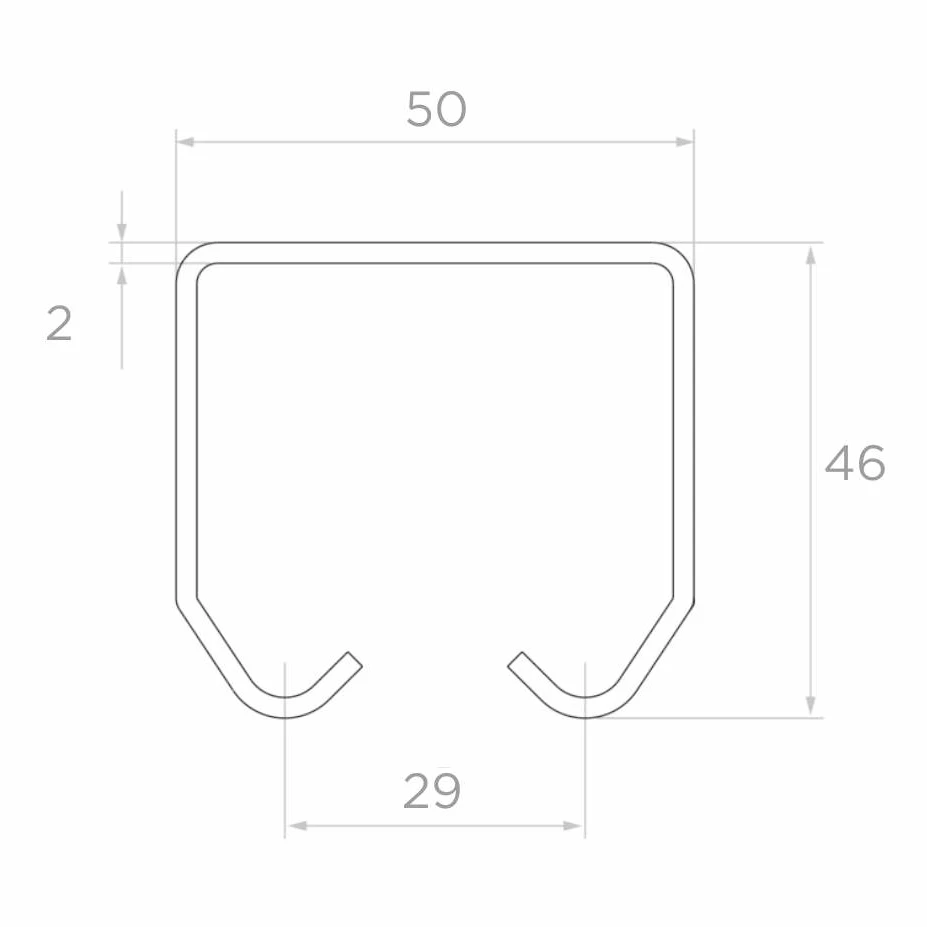 Profiilin poikkileikkaus 50×46 mm ja seinämän paksuus 2 mm takaavat riittävän jäykkyyden ja kantavuuden koko porttirakennelmalle. Kiskon pituus 2900 mm mahdollistaa joustavan ajoaukkojen suunnittelun — kiskoja voidaan liittää toisiinsa, jolloin ohjurin kokonaispituus voidaan sovittaa portin vaatimaan välimatkaan.