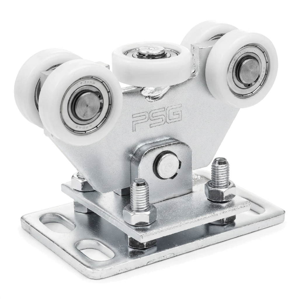 Kärryt on varustettu 5 muovirullalla – 4 pystysuoralla rullalla sekä 1 vaakasuoralla rullalla, joka vakauttaa portin sivuttaispoikkeamat. Rullat on asennettu kuulalaakereiden varaan, mikä takaa pitkän käyttöiän ja minimaalisen vierintävastuksen. Liitos asennusalustaan toteutetaan tapilla, joka mahdollistaa kärryn keinumisen ja kompensoi mahdolliset ajoradan epätasaisuudet.