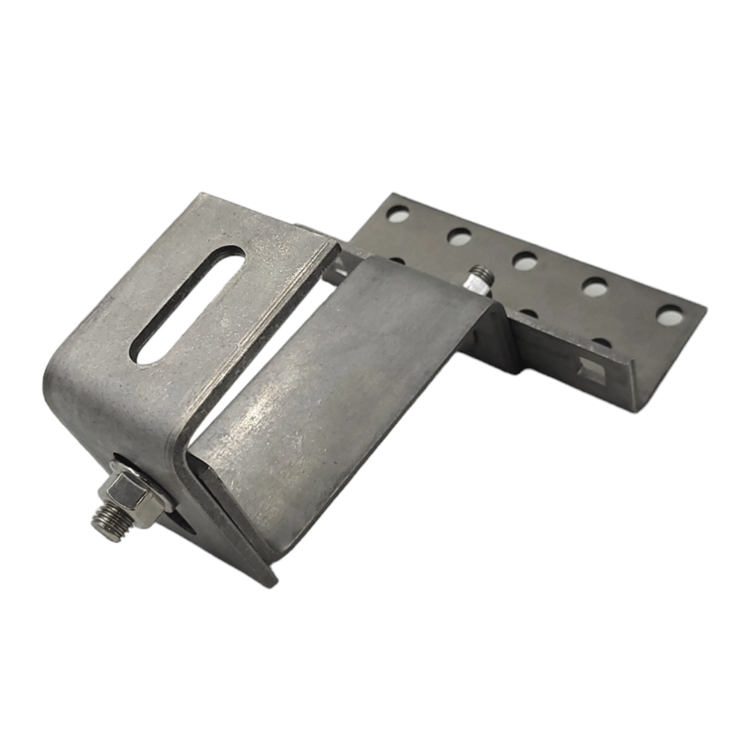 Vario-tyyppinen säädettävä kattokiinnike 4-4-4 levennetyllä Z-profiililla, ruostumaton teräs H17/1.4016, mitat 145x50x4/4mm/4mm M10-reiällä aurinkosähköjärjestelmien profiileja varten.