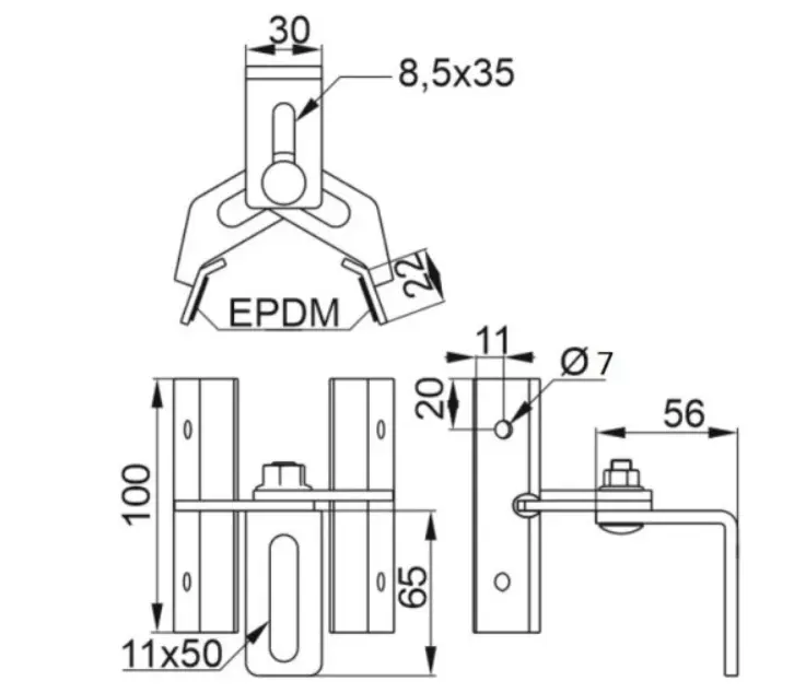 Säädettävä kiinnike trapetsilevylle. Tarkoitettu aurinkosähköjärjestelmien profiilien asennukseen metallisille poimukatoille. Mahdollistaa nopean asennuksen ilman kattotuolien paljastamista ja katon rakenteen vahingoittamista.